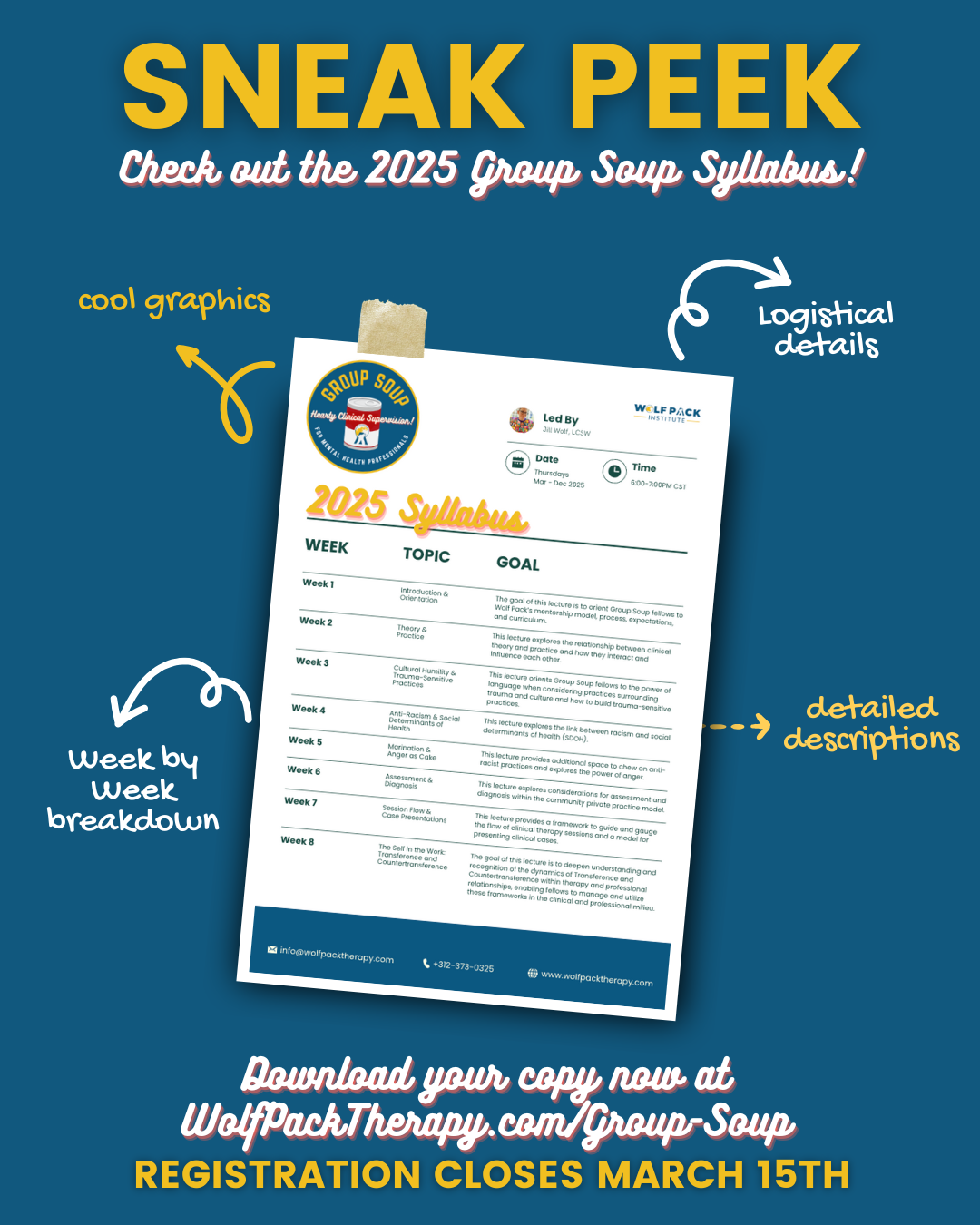 Group Soup offers an inclusive community for mental health professionals and trainees who seek more: more consistency, collaboration, and connection to the heart of clinical practice. Together, we explore concepts, unpack cases, and connect theory to practice, all while fostering meaningful growth.